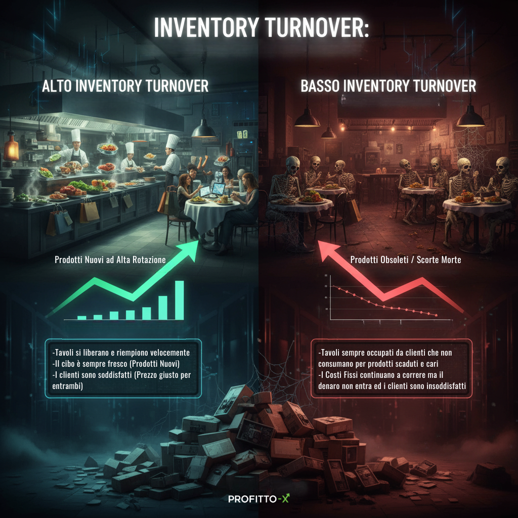 - Un basso inventory turnover è un ristorante con tavoli sempre occupati da clienti che non consumano. I costi fissi (affitto del magazzino, assicurazione) continuano a correre, ma il denaro non entra.