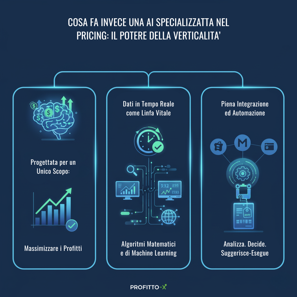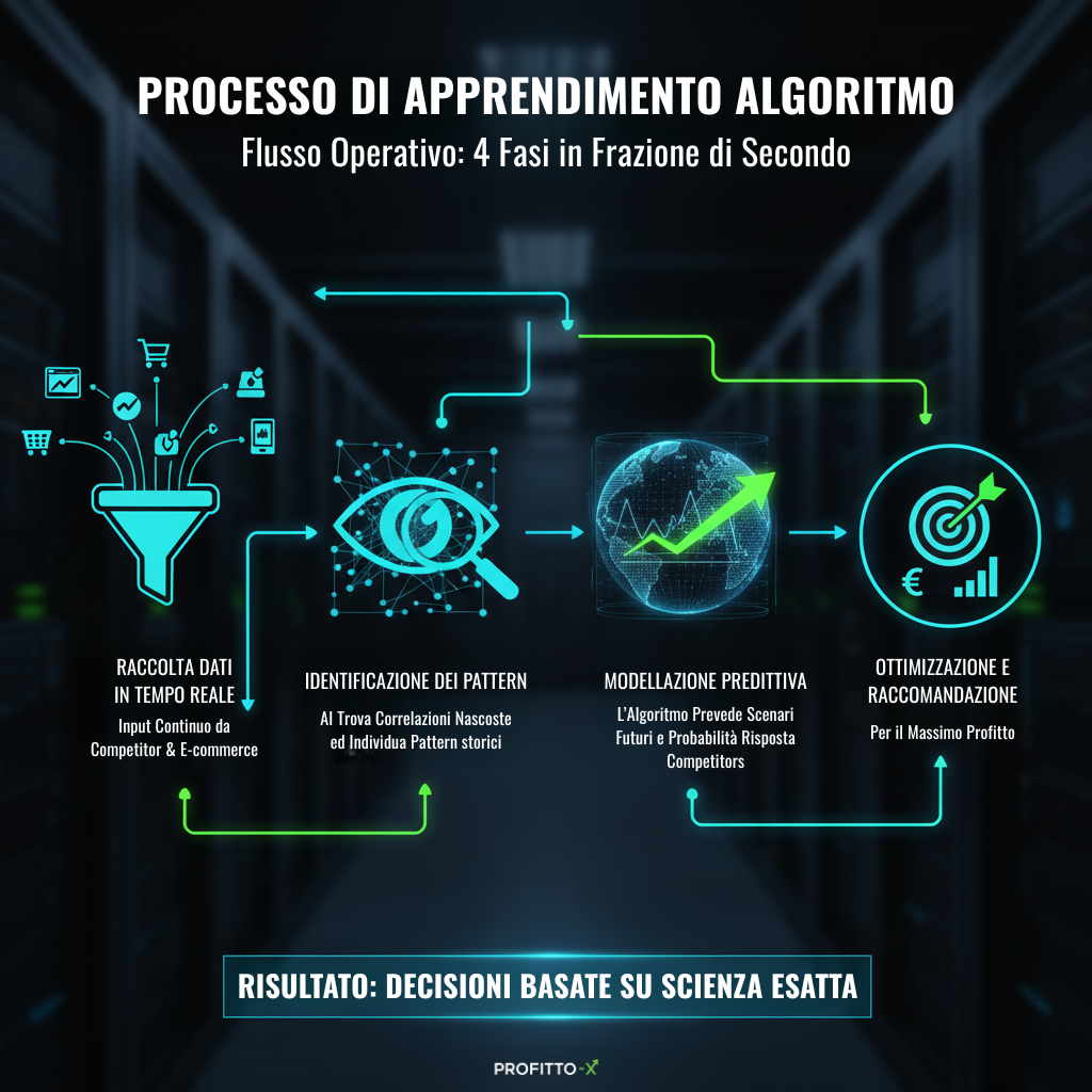 Questa capacità di apprendimento continuo è ciò che distingue un'AI di profitto come ProfittoX da un semplice AI repricer basato su regole, trasformando il pricing da una reazione a una strategia predittiva.